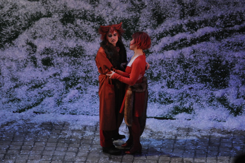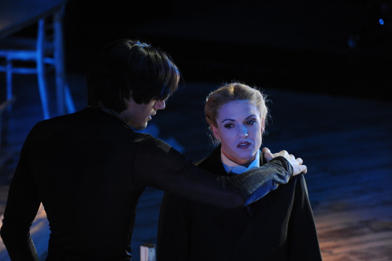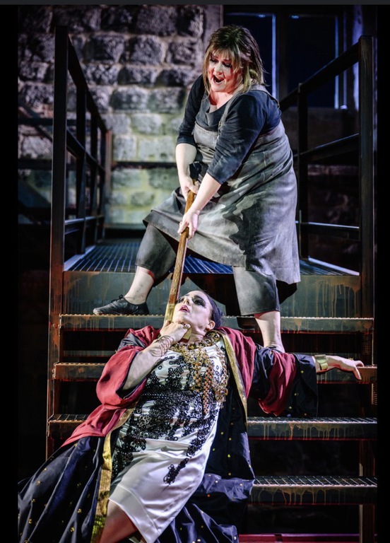 Auf den Gehstock stützt sich bei „Elektra" die grausame Königin Klytämnestra, von Katerina Hebelková als eine Mischung aus Wahrsagerin und Wahnsinniger gespielt. Elektras Mutter ist gebrochen von den blutigen Dramen, die sich in ihrer Familie abspielen, wird von Alpträumen gejagt und sucht eigentlich Zuflucht und Absolution bei ihrer Tochter Elektra, die von ihren Racheplänen aber nicht abrückt. Die tschechische Mezzosopranistin macht den Zwiespalt der Figur plastisch und war auch stimmlich die perfekte Ergänzung zu ihren beiden
